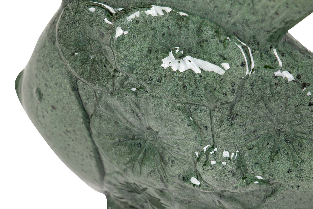 Esta figura de pez en cerámica verde, con medidas de 30x24x10 cm, presenta un diseño elegante y acabado brillante que aporta frescura y sofisticación a cualquier espacio. Ideal para añadir un toque de estilo natural y contemporáneo, esta pieza decorativa realza ambientes modernos con un aire sereno y refinado.